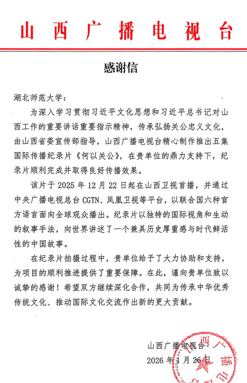 本网讯 近日,学校收到一封来自山西广播电视台的感谢信。对湖北师范大学银龄学者石麟教授在山西省委宣传部指导、山西广播电视台精心制作的五集国际传播记录片《何以关公》制作工作中,为传承中华优秀传统文化、促进国际文化交流做出的积极贡献表示衷心的感谢。